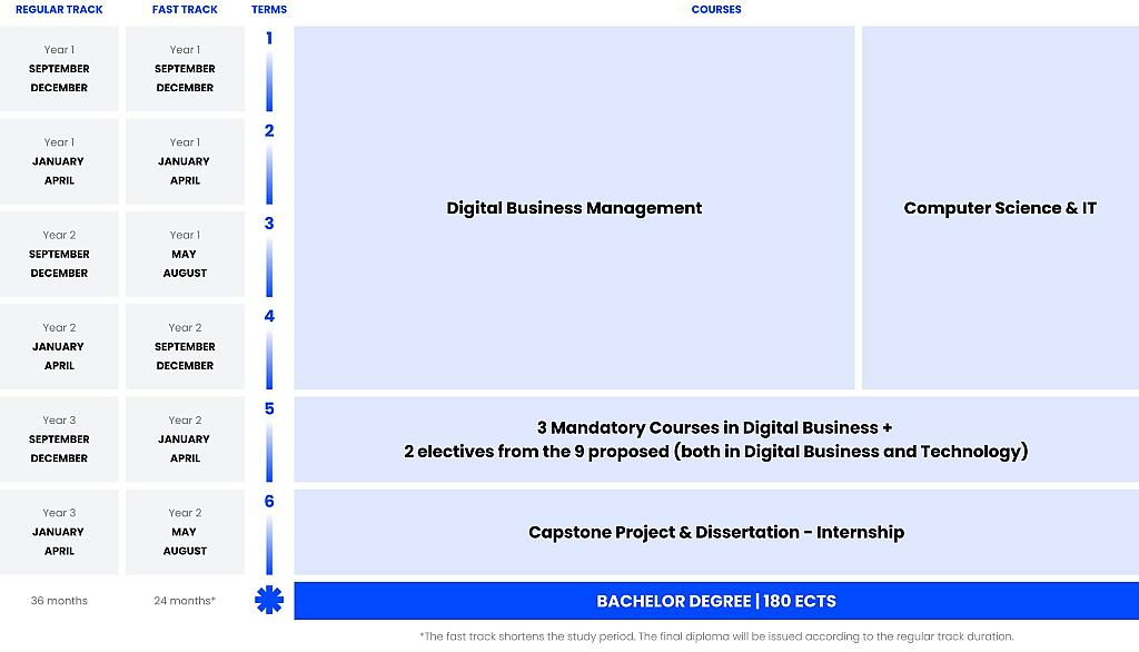 The Bachelor’s is structured with 5 Terms of courses and 1 final Term for the dissertation/project. In Term 5, you have 3 compulsory modules in Digital Business and can then pick 2 elective courses out of 9 based on your interests.